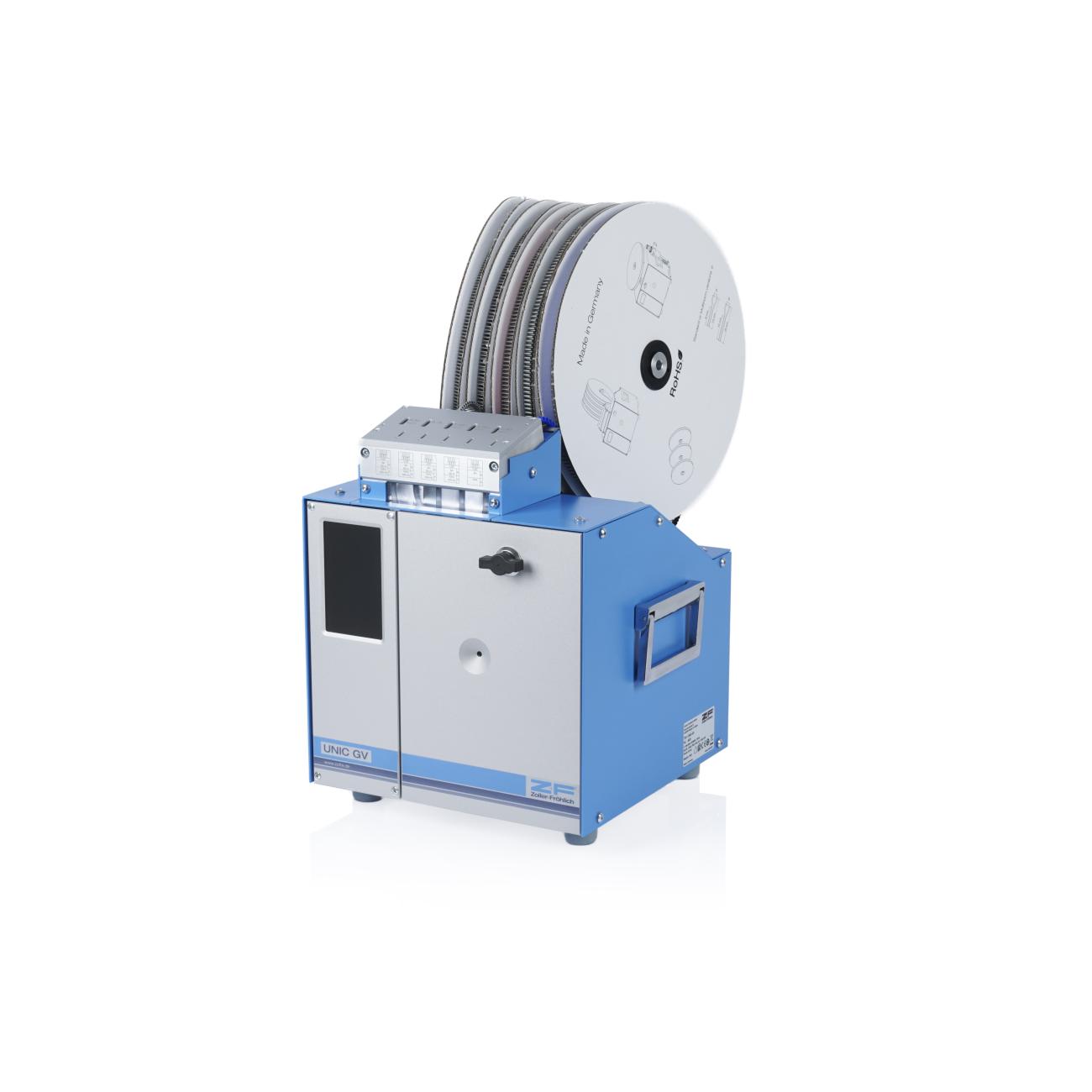 De UNIC-GV is een elektropneumatische tafelstrip- en krimpmachine die tot vijf hulzen op rol met verschillende doorsneden kan verwerken. Hulzen op rol met een bereik van 0,5 mm² tot 2,5 mm² (AWG 20 – 14) en krimplengtes van 8 mm of 10 mm kunnen zonder stilstand verwerkt worden. De gebruiker selecteert eenvoudig de doorsnede via een aanraakscherm. Hulzen op rol voor multistandaardgeleiders kunnen ook worden verwerkt.
